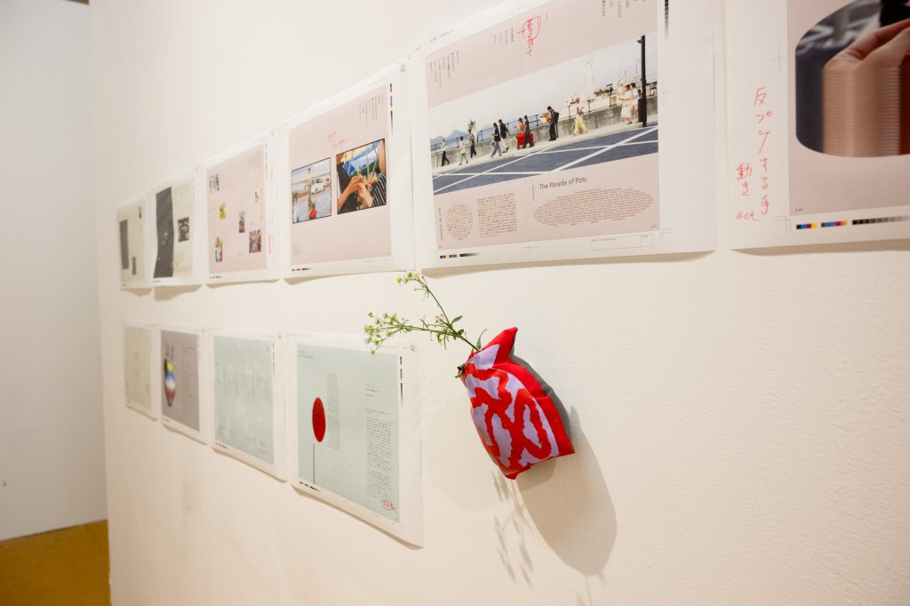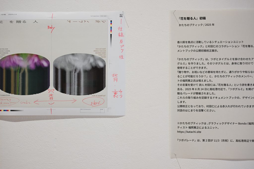 カタチのブティックによる「ツボグルミパレード」によって行われたアクション「花を贈る人」を記録するドキュメントブックの初稿を展示し、それに村田が赤入れをするという企画。