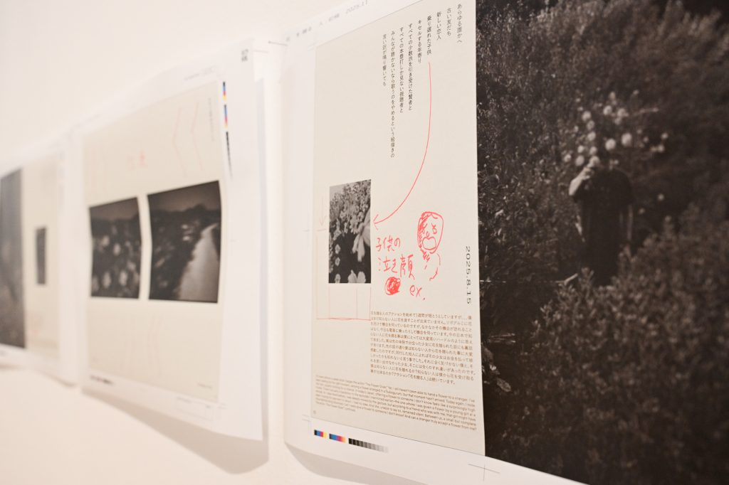『花を贈る人 公開校正展示』2025年11月1日-2日 長者町コットンビル1階ギャラリー「詩人ラジオ まんまえ投壜通信」展 にて。